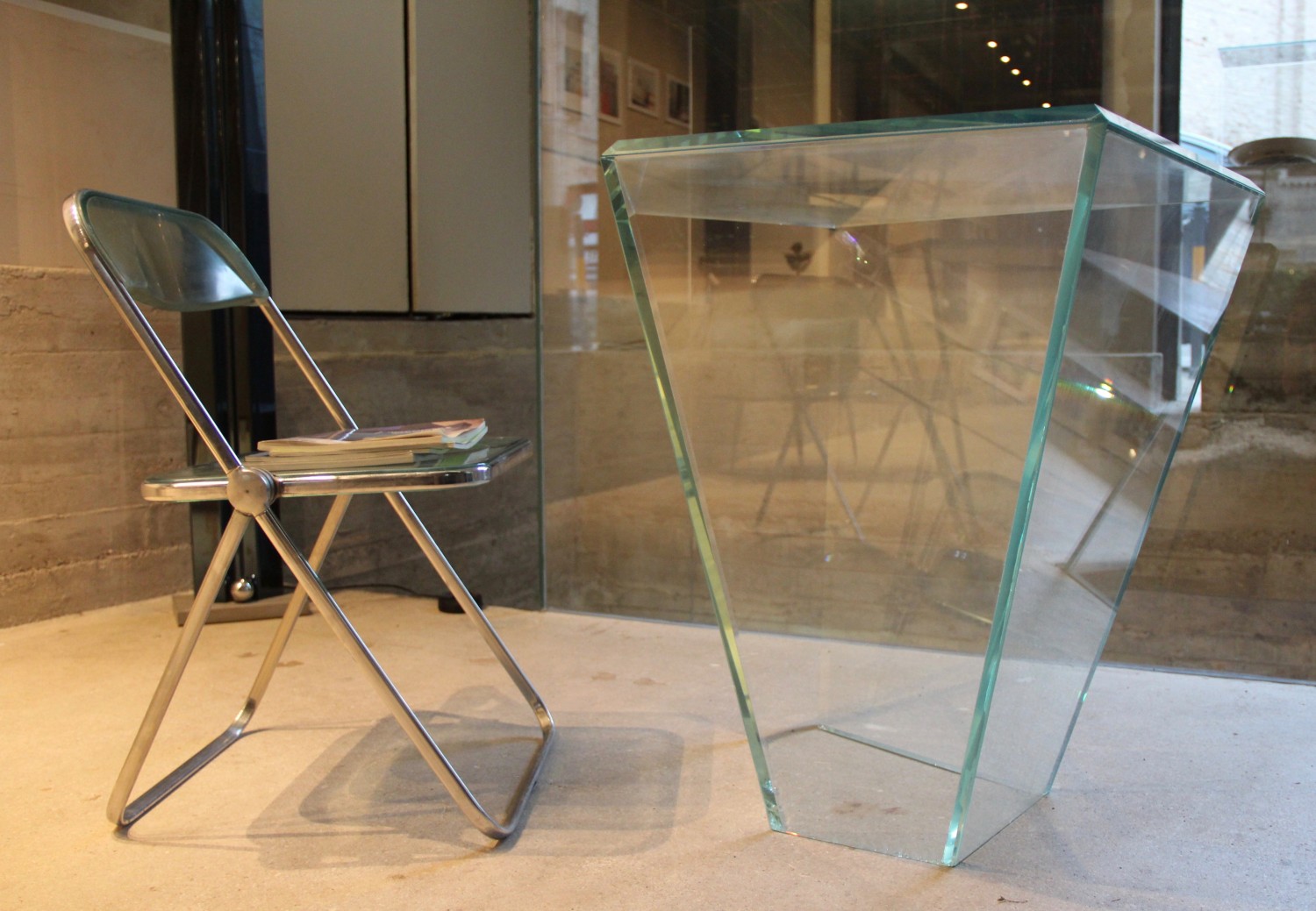 Tavolo composto da lastre di cristallo extrachiaro incollate assieme a 45°. Completo di piedini in gomma